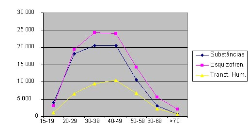 Referente à faixa etária, observamos que os maiores números de internações foram relativas às faixas etárias entre 20 e 49 anos, no Brasil, entre janeiro a setembro de 2008, tanto por abuso de substâncias em geral como por transtornos do tipo esquizofrênico e de humor (gráfico 4). Essa proporção foi curvilínea, ou seja, aumentou a partir dos 15 anos de idade e diminuiu após os 49 anos de idade. Desse modo, observamos que a maioria das pessoas que receberam internações para os transtornos avaliados se encontrava no período economicamente ativo.