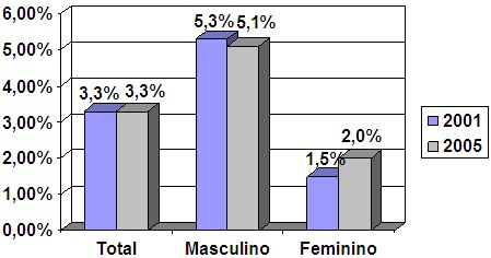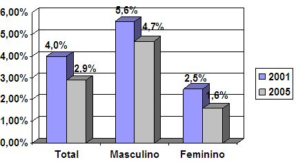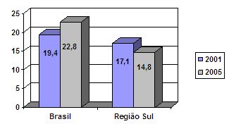 Avaliando apenas a região Sul, percebe-se uma estabilidade na busca por atendimento, sendo possível observar um leve decréscimo na busca de atendimento por parte dos homens (0,25%) e um ligeiro aumento de busca por tratamento pelo sexo feminino (0,5%), de 2001 a 2005.