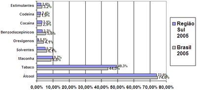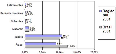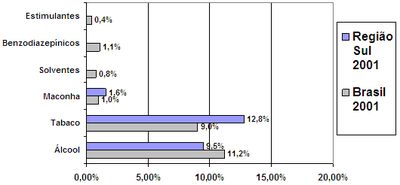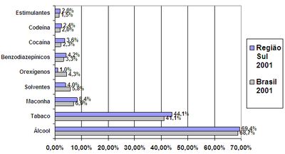 Em relação ao tipo de droga, no ano de 2001, verificaram-se escores superiores na região Sul, em relação ao Brasil, no uso na vida de: tabaco (3%), maconha (1,5%), cocaína (1,3%), benzodiazepínicos (0,9%), álcool (0,7%), codeína (xaropes) (0,4%) e estimulantes (0,5%). Comparando com todas as regiões, a região Sul é a que apresenta os maiores índices de uso na vida de maconha e cocaína no período.