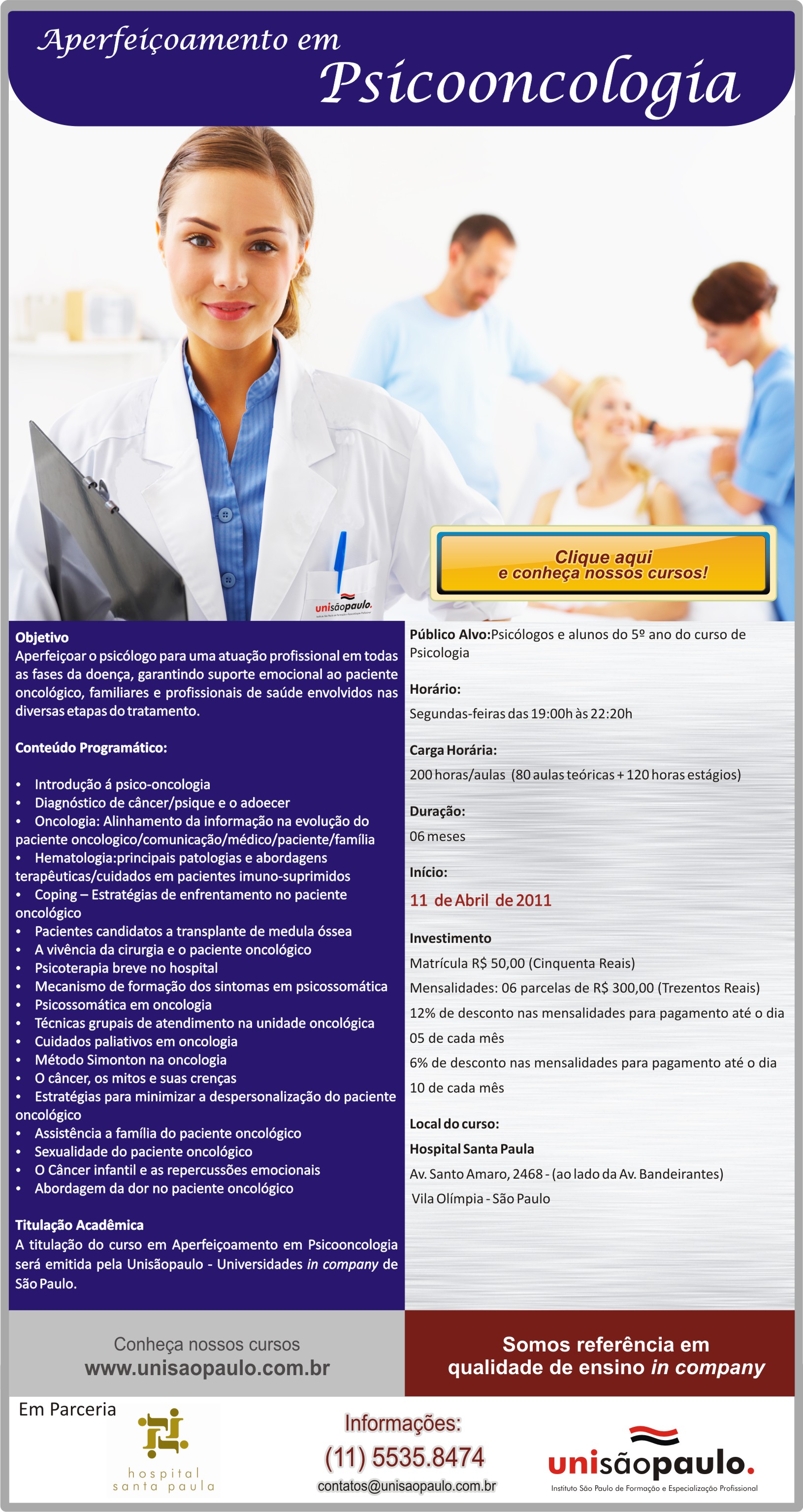 Esta é uma área de atuação psicológica em expansão e com necessidade de profissionais qualificados. No dia 11/04/2011 (segunda-feira) das 18:30hs às 22:30hs a Unisãopaulo em parceria com o IOHSP – Instituto de Oncologia do Hospital Santa Paula estará iniciando mais uma turma de Aperfeiçoamento em PsicoOncologia, com uma sólida formação teórica e atendimento a pacientes oncologicos.