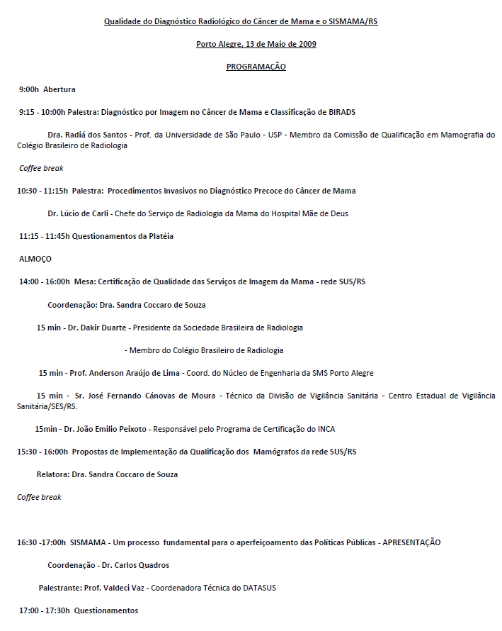 Segundo informações da Secretaria Estadual da Saúde, o objetivo deste evento é capacitar técnicos para o uso de serviçosradiológicos pelo Sistema Único de Saúde (SUS). As atividades estão previstas para iniciar às 9h da manhã, no Hotel Coral Tower (Av. Protásio Alves, 2966 - Petrópolis, Porto Alegre/RS). Confira a programação: