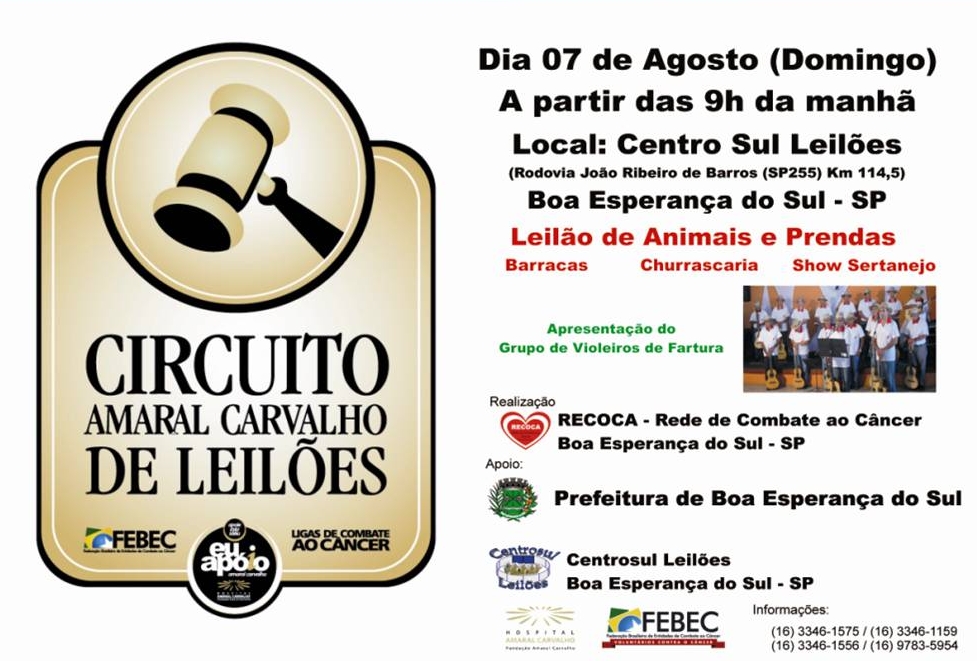 No próximo domingo (07/08), ocorre leilão em prol do Hospital Amaral Carvalho e da Federação Brasileira de Entidades de Combate ao Câncer (Febec) em Boa Esperança do Sul. A ação faz parte do Circuito de Leilões das duas entidades e começa as 9 horas.