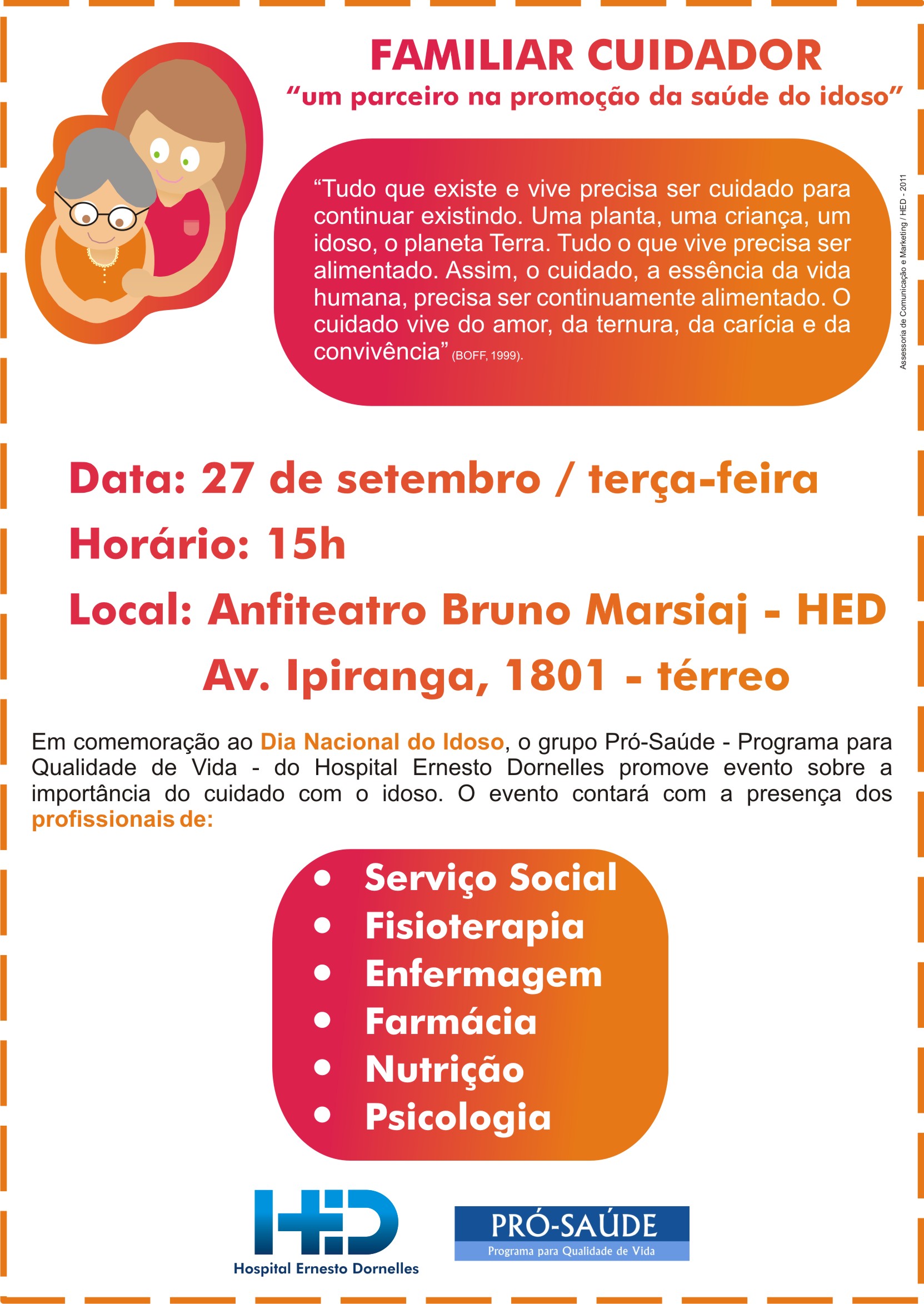 Em homenagem ao Dia do Idoso, o Hospital Ernesto Dornelles promove o evento “Familiar cuidador: um parceiro na promoção da saúde do idoso”. Destinado principalmente a familiares que convivem com pessoas de idade, o encontro terá a participação de profissionais de serviço social, fisioterapia, enfermagem, farmácia, nutrição e psicologia.
