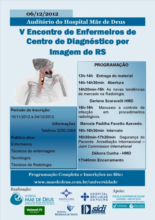 O V Encontro de Enfermeiros de Centro de Diagnóstico por Imagem do RS está programado para ocorrer no dia 06 de dezembro deste ano, às 13h, no Auditório do Hospital Mãe de Deus, Rua José de Alencar, 286, Porto Alegre-RS.