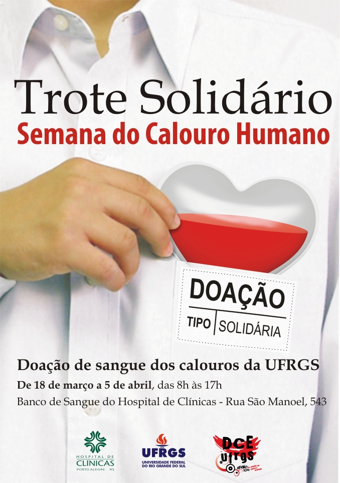 O Trote Solidário acontece entre 18 de março e 5 de abril, de segunda a sexta-feira, das 8h às 17h no Banco de Sangue do HCPA (Rua São Manoel, 543).
