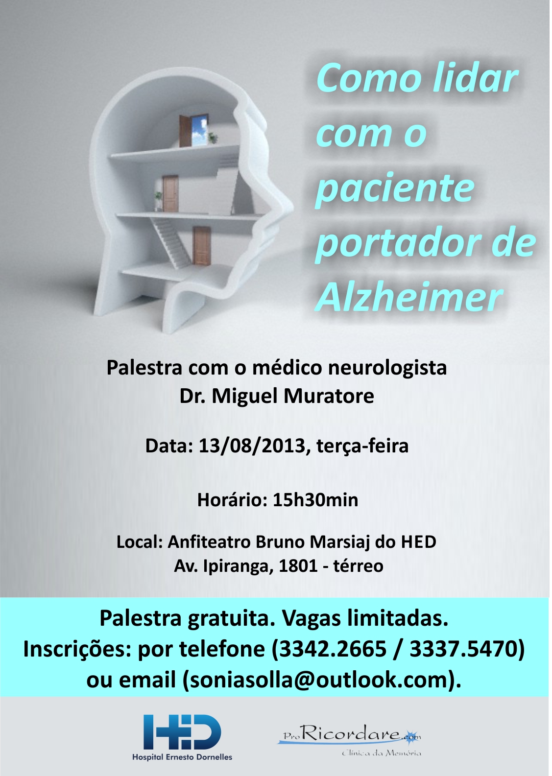 No dia 13 de agosto, terça-feira, às 15h30, o Hospital Ernesto Dornelles abre as portas do Anfiteatro Bruno Marsiaj (térreo) para a palestra “Como lidar com o paciente portador de Alzheimer”, que será ministrada pelo médico neurologista Dr. Miguel Muratore.