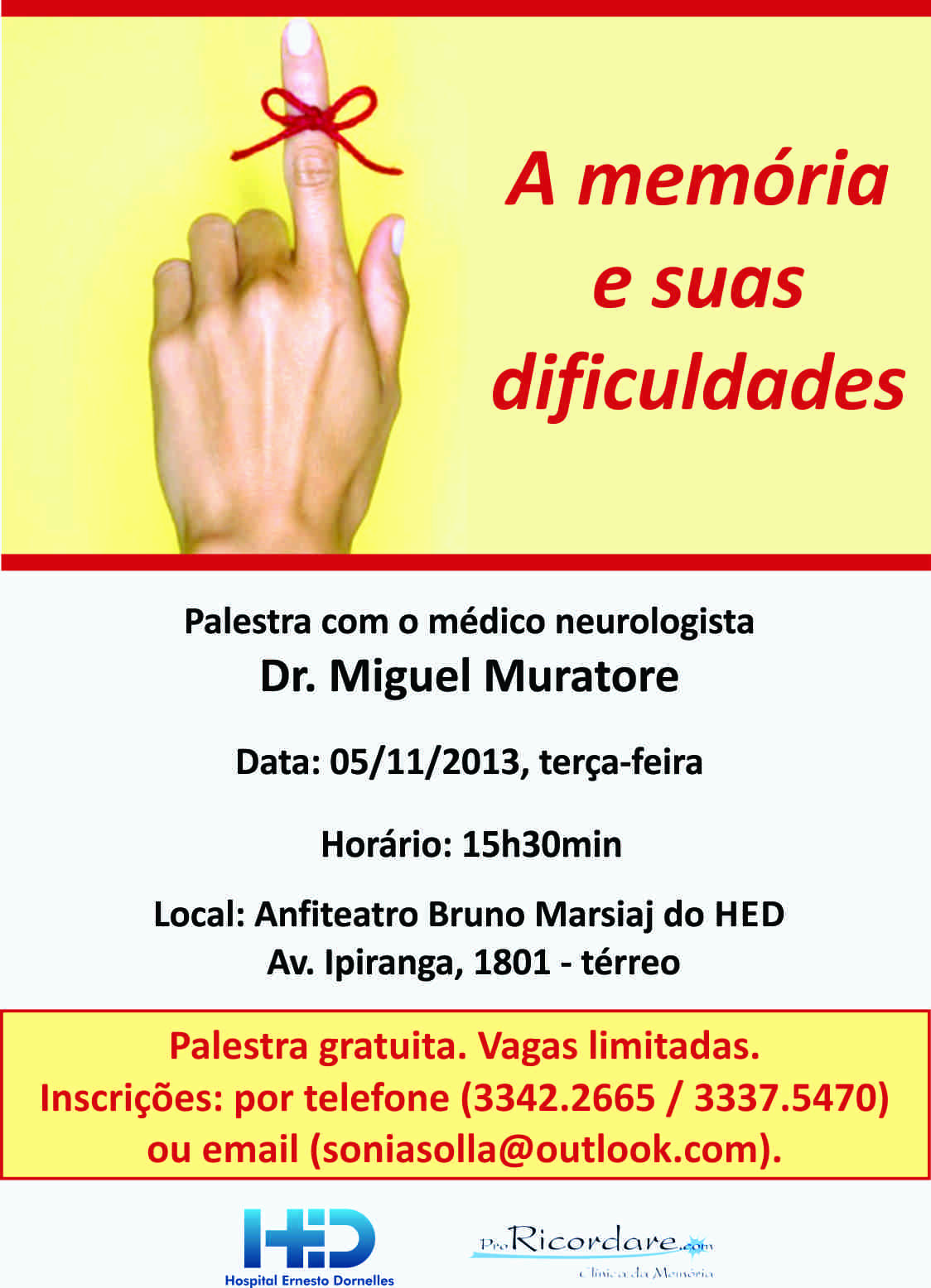 O Hospital Ernesto Dornelles apresenta, no próximo dia 5 (terça-feira), às 15h30, a palestra “A memória e suas dificuldades”, no Anfiteatro Bruno Marsiaj - Av. Ipiranga 1801, Térreo. O evento será ministrado pelo médico neurologista Miguel Muratore. A entrada é gratuita, mas as vagas são limitadas. Inscrições podem ser realizadas pelo telefone (051) 3342-2665 e (051) 3337-5470, ou, através do email soniasolla@outlook.com.