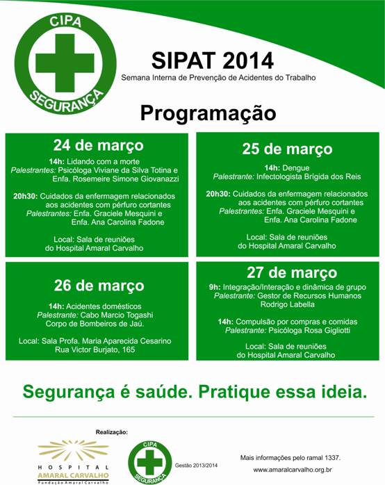 O evento, que é uma organização da Comissão Interna de Prevenção de Acidentes (Cipa) — gestão 2013/2014, será aberto ao público e irá contar com palestras de temas variados, com profissionais do HAC e convidados.