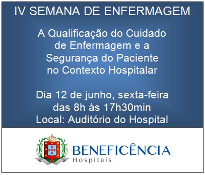 A Qualificação do Cuidado de Enfermagem e a Segurança do Paciente no Contexto Hospitalar é o tema central de sete encontros voltados à formação científica e profissional que assinalam a realização da IV Semana de Enfermagem na Beneficência.