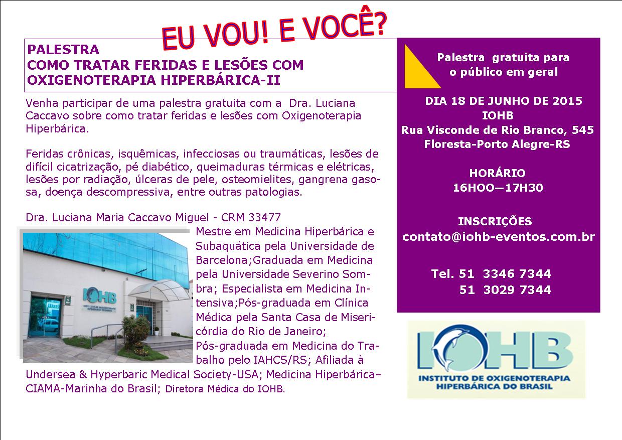 Neste sentido, com um tema diferente a cada quinze dias, O IOHB promove uma palestra gratuita destinada a toda população de Porto Alegre, médicos, enfermagem, técnicos e demais profissionais da área da saúde, e gostaríamos contar com sua participação e na colaboração na divulgação das palestras, que ocorrerão quinzenalmente. No final de cada trabalho, com duração aproximada de 1h30, os participantes terão a oportunidade de conhecer os equipamentos e a rotina de cuidados com os pacientes do Instituto.