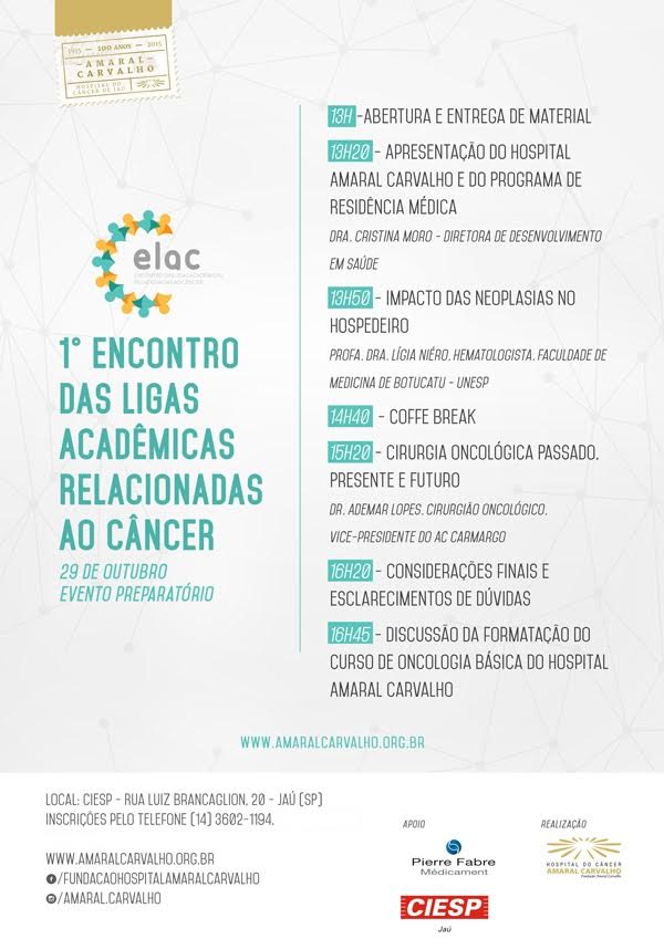 O Elac é um evento preparatório para cursos permanentes de oncologia que serão ministrados duas vezes ao ano, no Hospital Amaral Carvalho, em períodos de férias escolares (janeiro e julho). “O objetivo é apresentar os temas de oncologia, em todas as áreas de atuação do Hospital Amaral Carvalho, a alunos de quarto e quinto ano de medicina, referendados pelas ligas acadêmicas. Com isso, pretendemos despertar no aluno interesse pela área e também pelo hospital, quando da decisão pelo Programa de Residência Médica”, explica o hematologista.