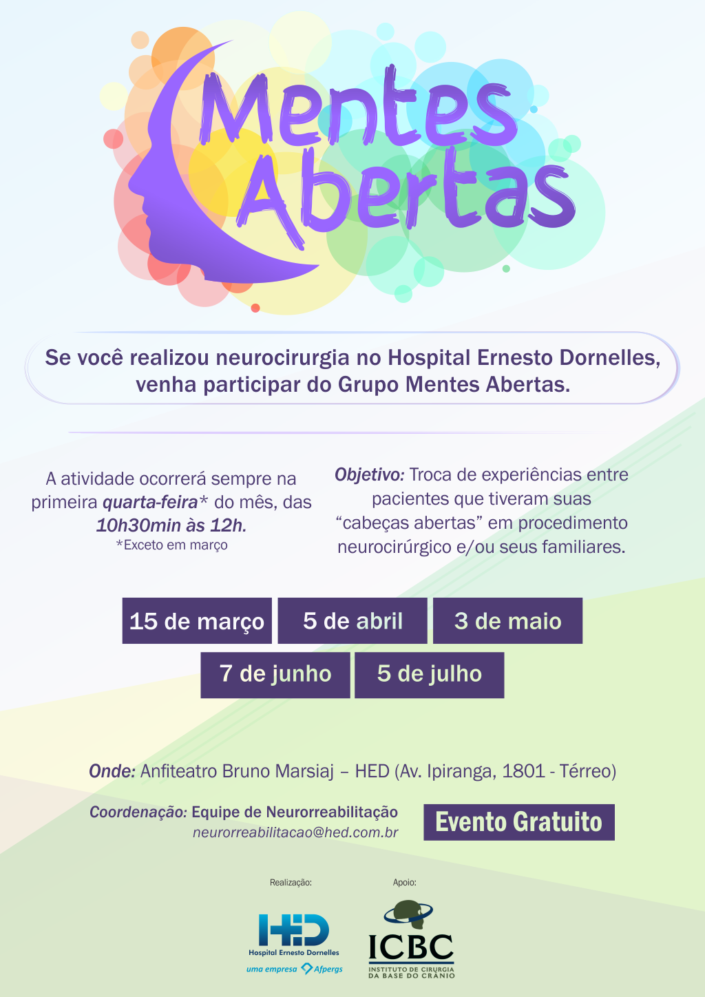 O Grupo Terapêutico Mentes Abertas, coordenado pela equipe de neurorreabilitação do Hospital Ernesto Dornelles, convida todos os pacientes que já realizaram neurocirurgia na instituição, assim como seus familiares, para participar das reuniões com o objetivo de trocar experiências a respeito da reabilitação.