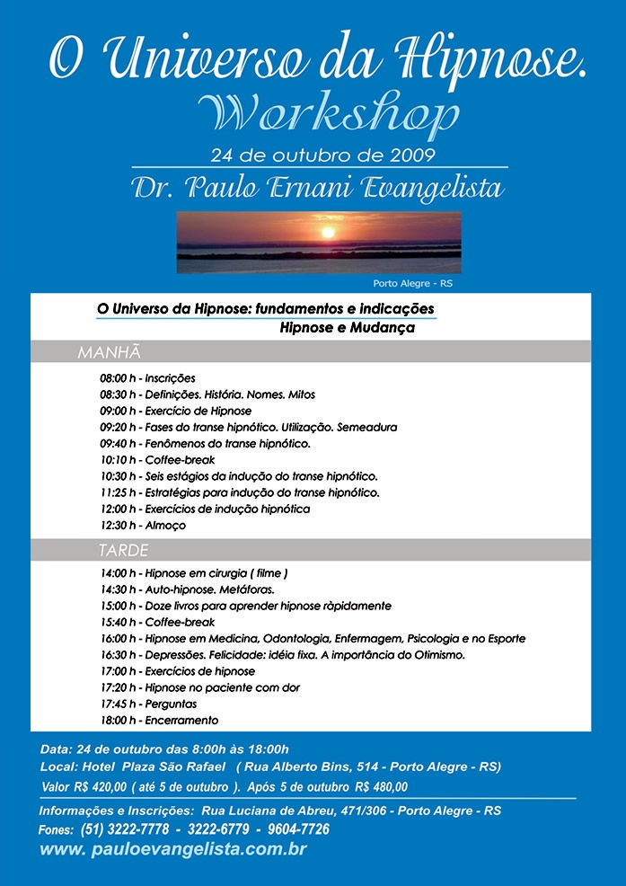 A hipnose na Medicina, Odontologia, Enfermagem, Psicologia e no Esporte é apenas um dos tópicos do workshop O Universo da Hipnose, que acontecerá no próximo dia 24 de outubro, no Plaza São Rafael, em Porto Alegre. Assim, o recurso da hipnose poderá ser utilizado por profissionais da área médica, professores e esportistas, como forma de auxiliar na resolução de problemas como medos, fobias, ansiedades, depressões e traumas.