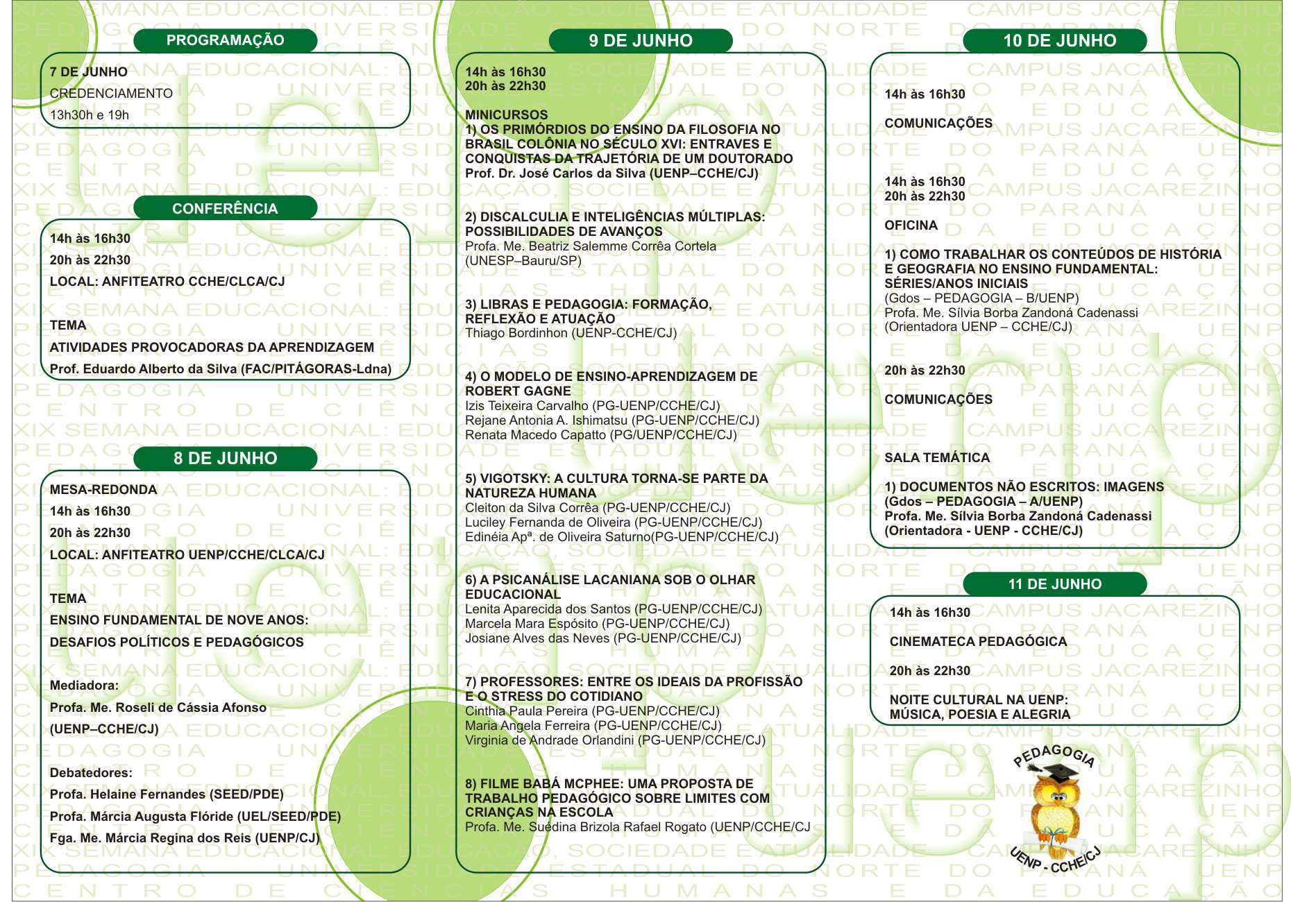 Nos demais dias do evento ofereceremos minicursos, oficinas pedagógicas, sala temática, cinemateca pedagógica e comunicações relacionadas ao saber e fazer pedagógico, para finalmente culminar com a Noite Cultural na UENP, apresentando os vários talentos universitários proporcionando música, poesia e alegria.